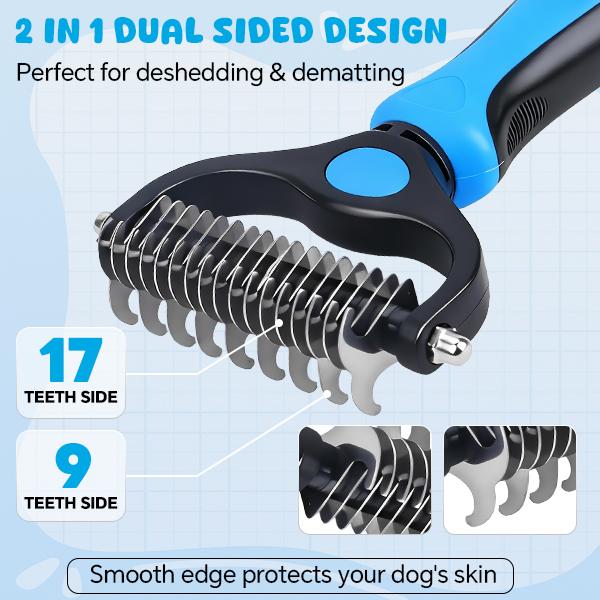 DUAL-SIDED DESIGN: Our grooming brush is perfect for dematting and deshedding your pet's coat! With a dual-sided design, use the 9-teeth side to tackle stubborn mats and tangles and the 17-teeth deshedding tool side to thin out your pet's fur. Gently desheds and removes loose hair and eliminates tangles, knots, dander, and trapped dirt keeping your dog looking their best.